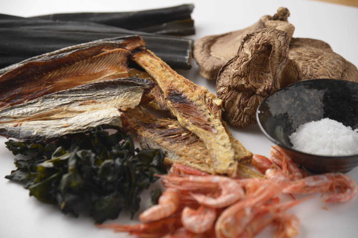 輪島産のトビウオの煮干しや天然輪島フグの骨、干し椎茸、甘エビ、海女さんが獲ったメカブに加え、北海道産の昆布と、輪島の海水で作った「能登・わじまの海塩」。