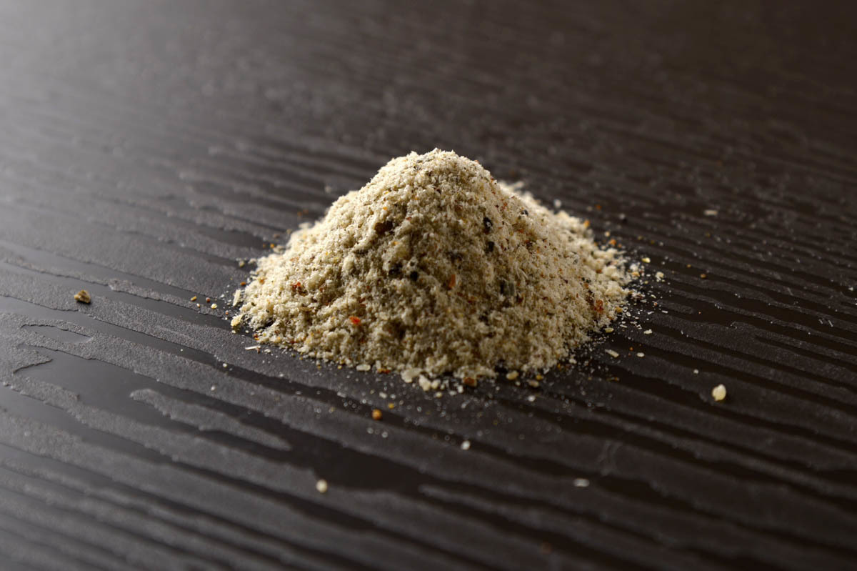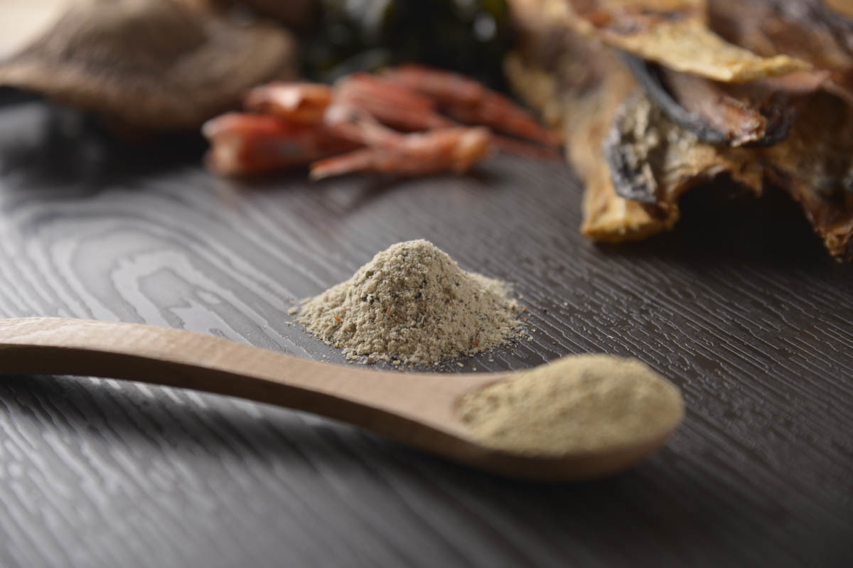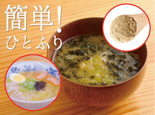 輪島産のトビウオの煮干し、天然輪島フグの骨、干し椎茸、甘エビ、メカブに加え、北海道産の昆布と、輪島の海水で作った「能登・わじまの海塩」を粉末にした、だしに、伊勢産のあおさを加えてあります。